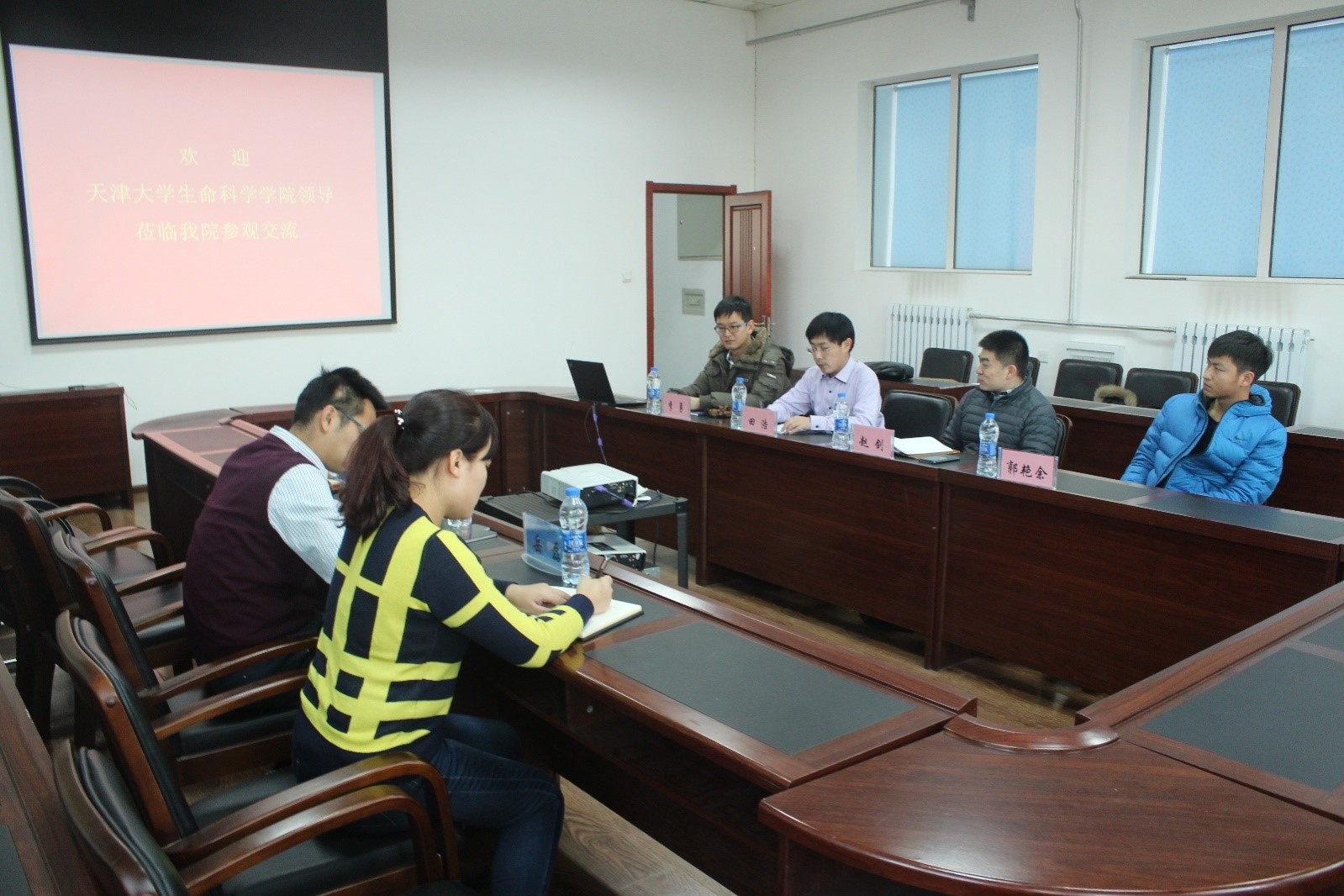 2016年1月11日下午,天津大学生命科学学院一行4人在副院长、党总支副书记赵剑带领下,来我院交流访问。生命学院党委副书记喻庆勇、生化仪器平台中心主任岳磊出席交流会。
