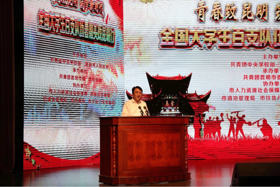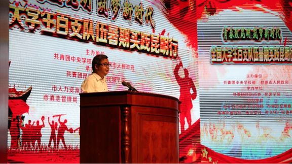市委副书记刘智同志代表市委市政府致欢迎词,他满怀深情地介绍了昆明市情概况,热烈欢迎各级领导及大学生实践队员昆明走进昆明、宣传昆明、服务昆明,希望来昆明的青年学子结合所见所闻、所思所想、所感所悟,为昆明地方经济振兴崛起注入强劲动力,为昆明发展提建议、出点子,贡献真知灼见,开启校地合作新篇章。