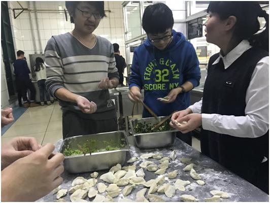 《汉书》有云:“冬至阳气起,君道长,故贺……”也就是说,人们最初过冬至节是为了庆祝新的一年的到来。由周到秦,以冬至日当作岁首一直不变,至汉代依然如此。活动开始,同学们分成三组,大家分工开始包。一些会擀皮、包饺子的同学主动帮助不会包的同学,俨然变成三十分钟饺子速成班。经过大家共同努力,酸菜馅,韭菜馅,玉米胡萝卜馅,青瓜虾仁馅的饺子集合着各种花样纷纷亮相,甚至还有各种搞怪的老干妈馅,芥末馅,硬币馅。包饺子结束后,同学们共进饺子宴,吃到了自己包的饺子,当然也免不了有吃到老干妈馅,芥末馅和硬币馅的“惊喜”。