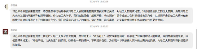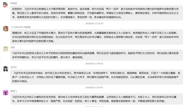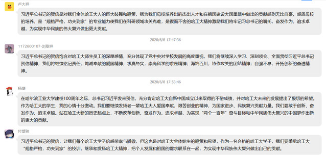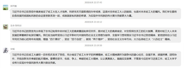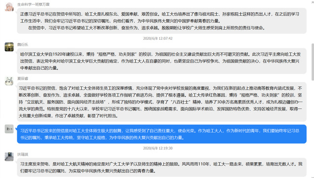 2020年6月7日为哈工大建校百年纪念日,习近平总书记致信庆贺哈尔滨工业大学建校一百周年,向全校师生员工和校友致以热烈的祝贺和诚挚的问候。生命科学与技术学院17级本科生共同学习了习近平总书记的贺信,倍感振奋,深受鼓舞,纷纷畅谈学习体会并发表在年级群中。