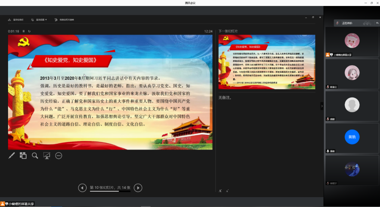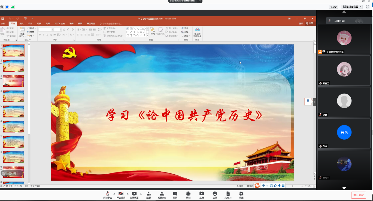 党支部副书记黄艳同志介绍了《论中国共产党历史》中的主要篇目,帮助年轻的党支部成员回顾学习习近平总书记的重要讲话精神。重点讲解篇目《知史爱党,知史爱国》与《中华民族伟大复兴历史进程的大跨越》。习近平总书记指出通过了解我们党和国家事业的来龙去脉,汲取我们党和国家的历史经验,正确了解党和国家历史上的重大事件和重要人物,能够坚定广大干部群众对中国特色社会主义的道路自信、理论自信、制度自信、文化自信。党支部成员们对杨靖宇等抗日联军英烈们的战斗故事震撼不已,纷纷发言表示新时代的我们应该传递前辈们为党和人民无私奉献的精神,努力钻研、攻关科研难题,与祖国的发展紧密联系在一起。
