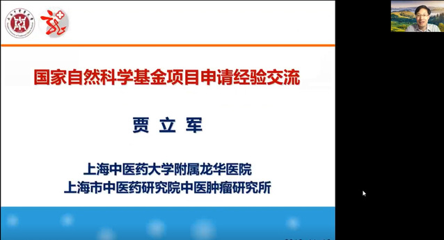 在生命科学与技术学院党委和工会的大力支持下,2022年10月12日上午,应胡颖教授邀请,上海中医药大学附属龙华医院、上海市中医药研究院中医肿瘤研究所所长贾立军教授通过线上方式进行了国自然基金申报专题报告,报告题目为“国家自然科学基金项目申请经验交流”。报告会由生命学院副院长胡颖教授主持,生命学院及生命科学中心的老师及博士生60余人通过线上和线下结合的方式积极参加了本专题学术活动。